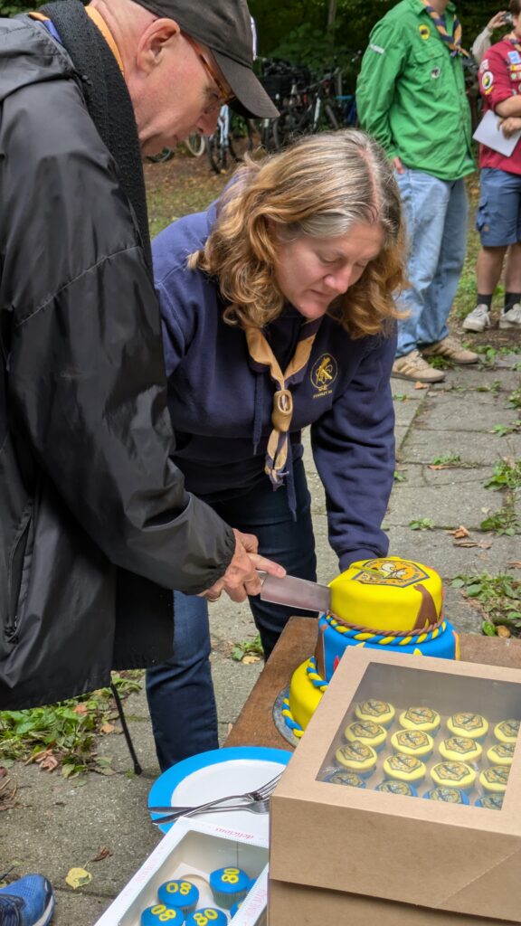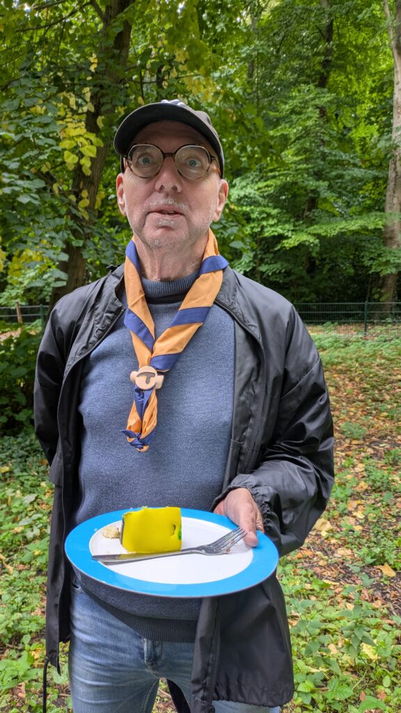 Barbara heeft natuurlijk ook een klein cadeautje gekregen – ook al is al het werk bij de scouts vrijwillig, zo’n attentie wordt natuurlijk bijzonder gewaardeerd! En tot slot heeft Barbara zelf Aad de das in de kleuren van Stanley geschonken.