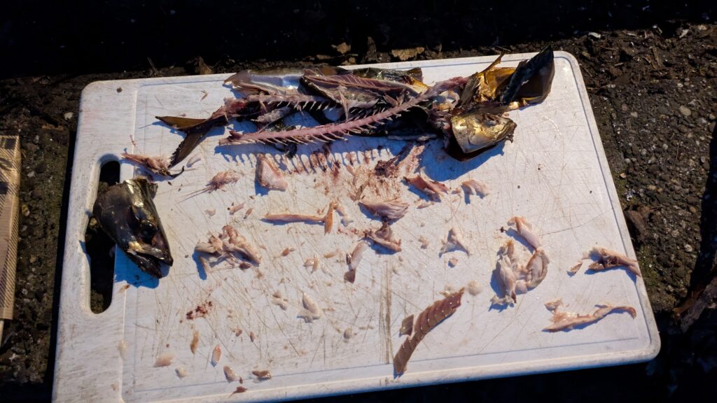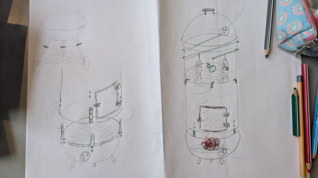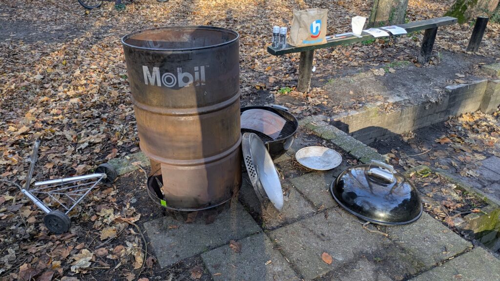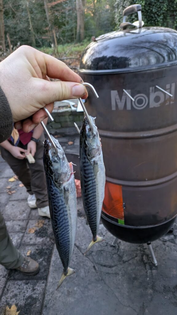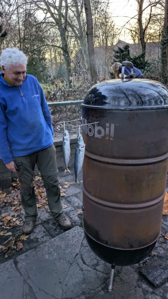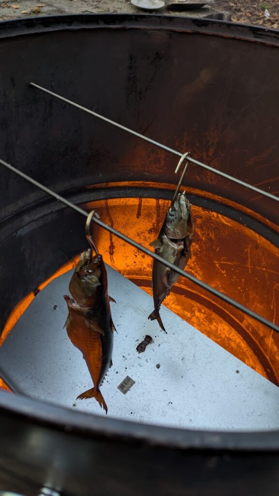 En toen was het zover: na hard werken was de rookton (bijna) klaar. Er ontbraken nog een paar kleine dingen, maar we wilden hem absoluut uitproberen – dus vuur aangestoken, makrelen erin en beginnen met roken.