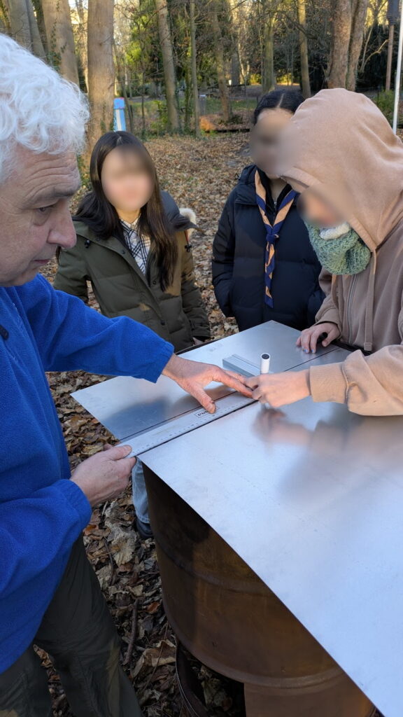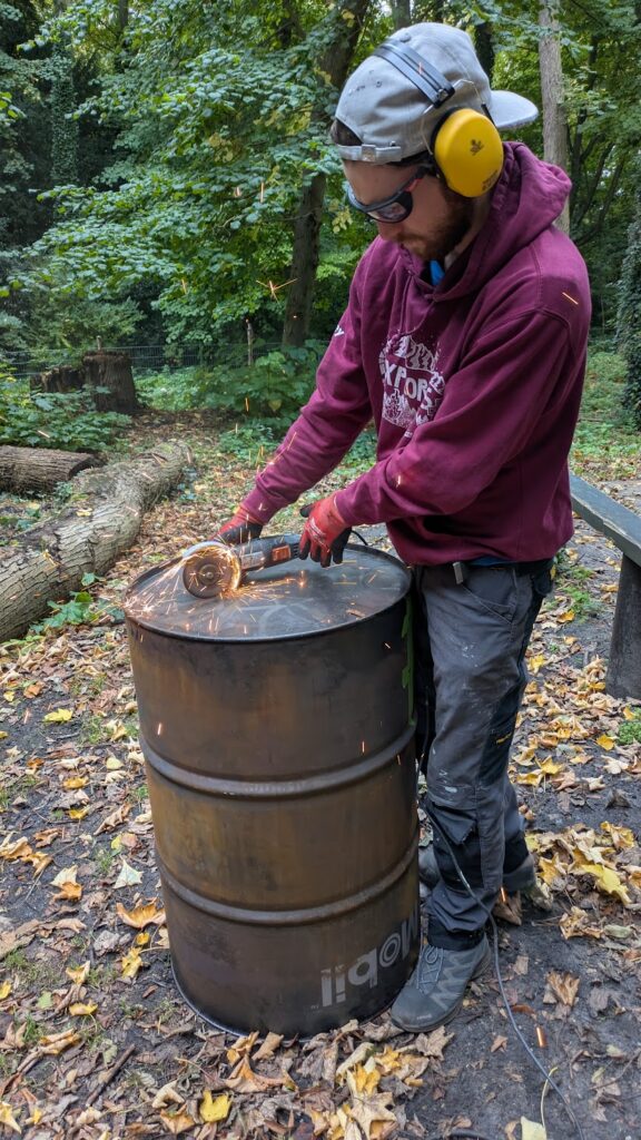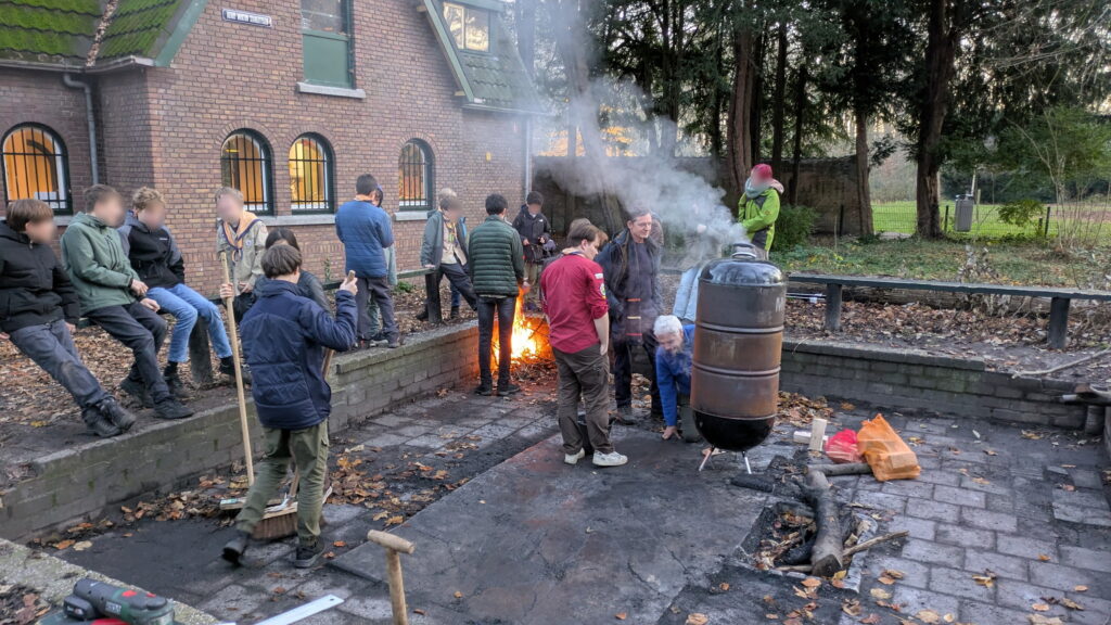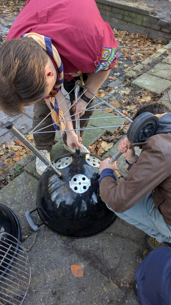 En nu hebben de scouts het overgenomen: de deur moest met scharnieren worden bevestigd, de hoeken voor de “vetplaat” en het rooster moesten worden aangebracht en er moesten heel wat gaten worden geboord – ook de poten van de oude barbecue moesten worden afgezaagd en op lengte worden gebracht.