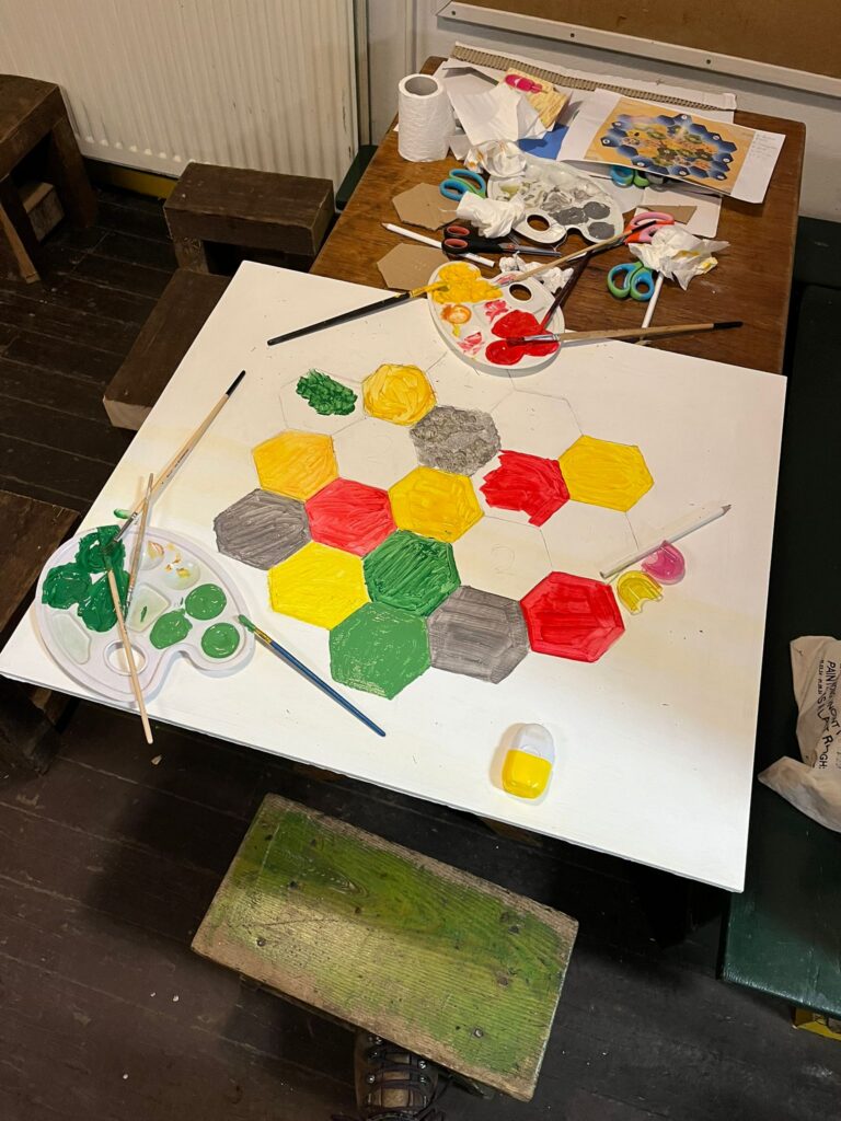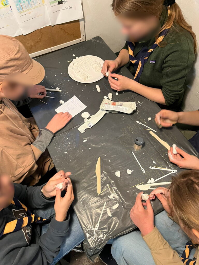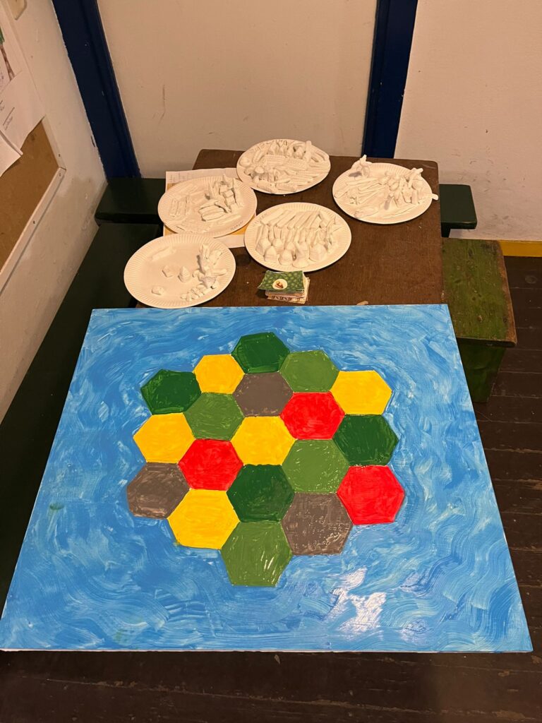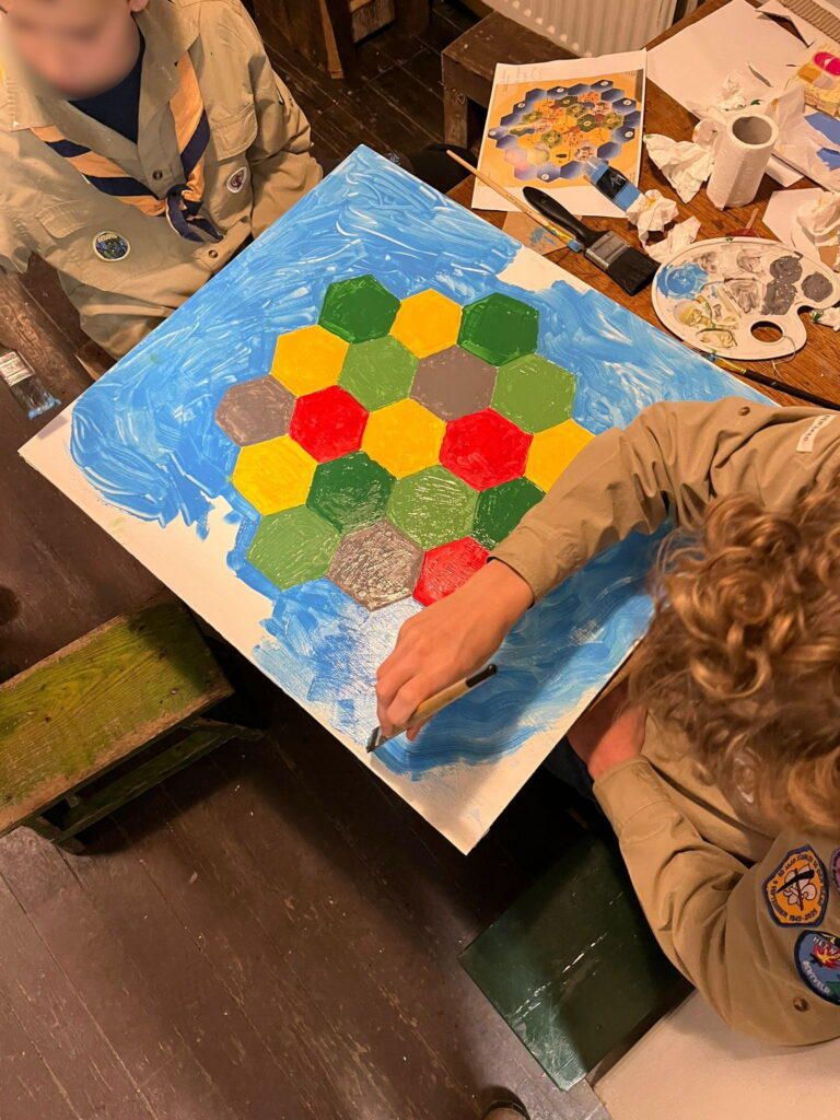 De scouts hebben vandaag hun eigen reuzen Catan spel gemaakt. Er werd een spelbord getekend en geverfd, elke patrouille maakten zijn eigen straten, dorpen en steden en alle benodigde kaartjes werden geknipt. Volgende week gaan we de dorpen en steden verven. Daarna kunnen we met de patrouilles tegen elkaar Catan spelen op de regenachtige zaterdagmiddagen die er deze winter aankomen.